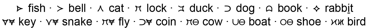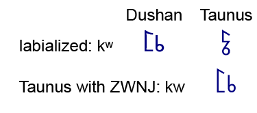 On the previous page, I mentioned that transcriptions usually use the Dushan Musa Alphabet font, which is monospace and uses no Advanced Typography features (so it will display reliably on almost any device). In Alphabet gait, these suffixes follow the letters they modify. But you may want to use Ligature gait, in which suffixes are combined with the letters they modify into ligatures – single letters that are taller (both ascenders and descenders). All you need to do is use a ligature font, like Taunus Musa Ligature.