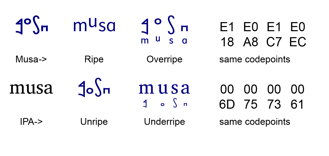 Going in the other direction, the Unripe Musa Trans font replaces IPA letters with the corresponding Musa letters, while the Underripe Musa Ruby font puts Musa letters underneath the IPA. Both of those put Musa in IPA codepoints.