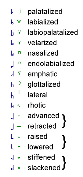 The IPA sure has a lot of diacritics: 31 of them, plus 7 suprasegmentals (we won't even talk about tones and intonation here). Most of them are only needed in narrow phonetic transcription, not for everyday spelling or even allophonic transcription. Musa has only 16 suffixes to cover the same scope, mostly because in many cases Musa offers single letters that incorporate the missing diacritic. In this section, we'll explain how that's done, treating each IPA diacritic in the order it appears in the IPA charts.